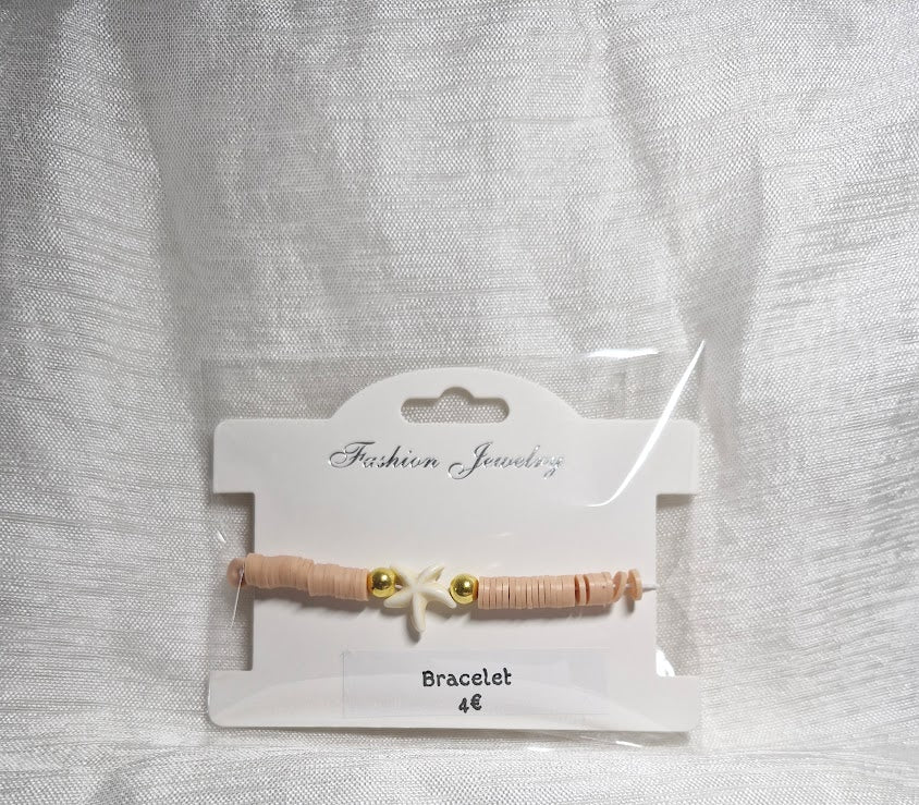 Magnifique bracelet élastique en perle plate d'argile et une étoile de mer au milieu.